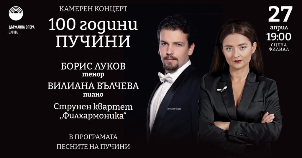 Концертът „100 години Пучини“ на 27 април във Варненската опера предоставя на публиката редкия шанс да чуе песенното творчество на Джакомо Пучини в изпълнение на тенора Борис Луков, акомпанимент на пиано Вилиана Вълчева и с участието на струнен квартет „Филхармоника“.