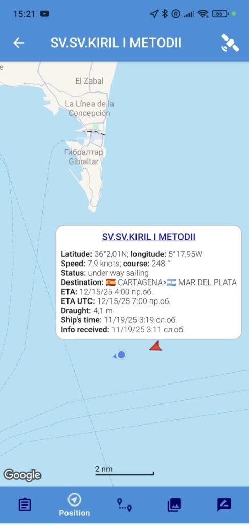 Научноизследователският кораб „Св. св. Кирил и Методий“ с бордови номер 421 премина през пролива Гибралтар и пое курс към следващото си пристанище – Мар дел Плата в Аржентина, където се очаква да пристигне в средата на декември. Плаването е част от задграничната мисия за осигуряване на научноизследователска и логистична подкрепа на 34-та Българска антарктическа експедиция.