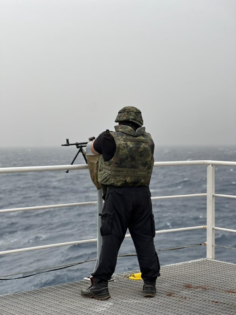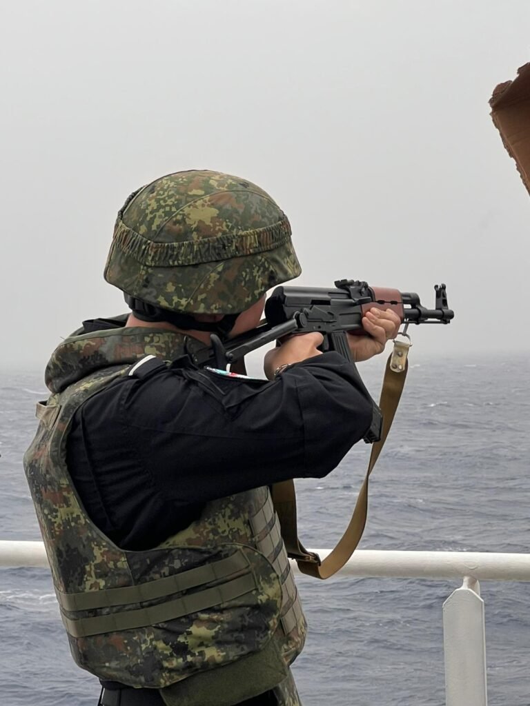 Като част от процедурите за сигурност, военните моряци на борда проведоха учебни стрелби с щатното въоръжение на кораба. Основната цел на учението е отработване на действия за отразяване на евентуални атаки от бързоходни плавателни съдове – тактика, често използвана от пиратските групи в района. От командването на кораба уточняват, че тези действия са част от предварително планираните извънредни мероприятия за защита на екипажа, кораба и превозвания товар за българската база на остров Ливингстън.