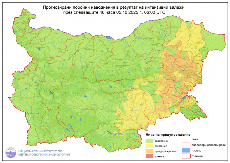 За 6 октомври 2025 г. НИМХ издава предупреждение за значителни валежи от дъжд. В 14 области предупреждението е от първа степен (жълт код), а в 10 области в Южна България – от втора степен (оранжев код). Очакваните количества на валежите до полунощ срещу вторник: в Северозападна България между 10 и 20 mm, в Предбалкана и Североизточна България – 20-35 mm в Южна – между 20 и 40 mm, а в Родопите и Югоизточна България – 45-60 mm.