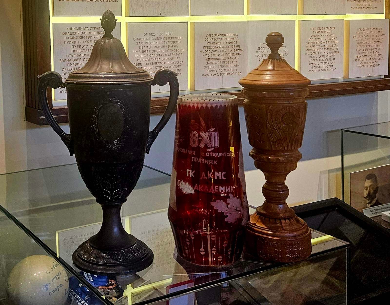 Следващият експонат също е емблематичен за времето си и представлява стъклена червена купа, връчвана за спортните събития на националния студентски празник „Купа 8 декември“ от ГК на ДКМС. За нея интересното е, че е с лика на някогашния лидер на държавата Георги Димитров.