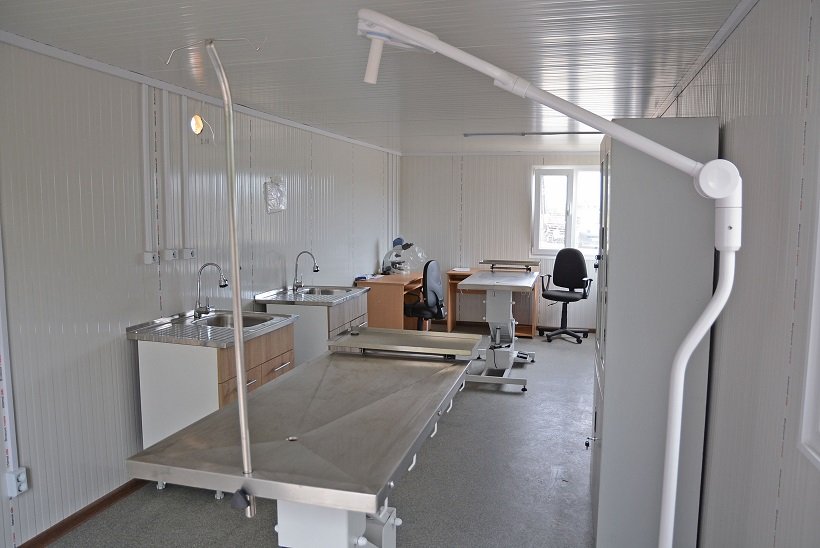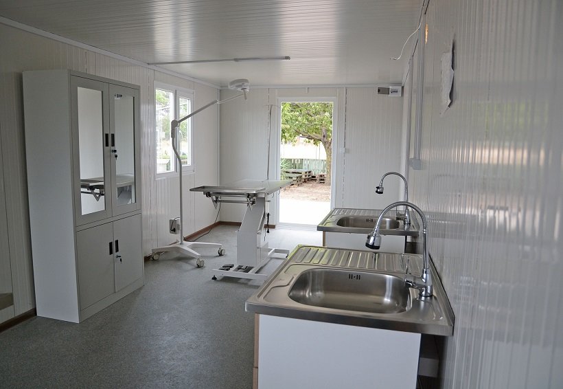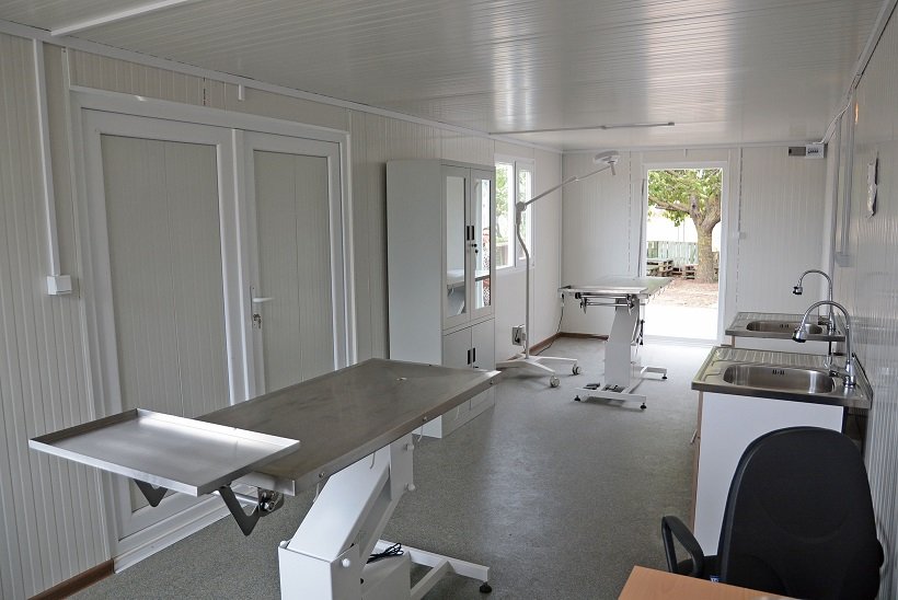 Във фургона са обособени операционна и манипулационна. Разположени са и две операционни маси с хидравлични механизми, операционна лампа и дигитален микроскоп с вградена камера, шкаф за съхранение на лекарства и 2 мивки. В най-кратки срокове се очаква да пристигне най-важната за лечението на животните апаратура – два апарата за хематологичен и биохимичен анализ.