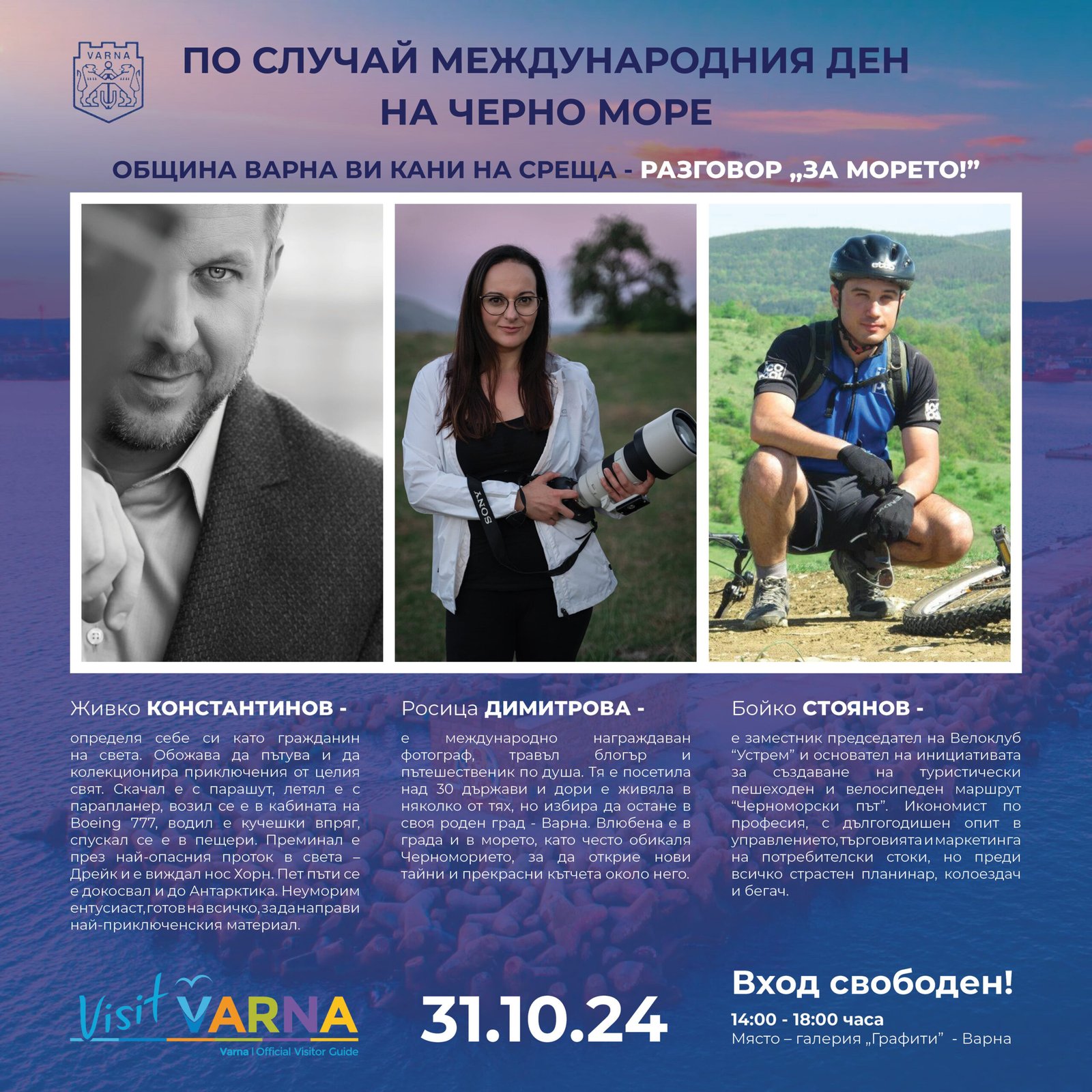 В дискусиите ще се включи и фотографът-пътешественик и травъл-блогър Росица Димитрова. За своите многолики фотографии от най различни места по света тя е отличена с редица награди. Посетила е над 30 държави, като дори е живяла в няколко от тях, но избира да остане в своя роден град – Варна. Димитрова е влюбена в морската столица и в морето, често обикаля Черноморието, за да открие нови и нови тайни и прекрасни кътчета около него.