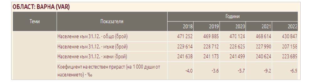По данни на НСИ населението на Варна към 31.12.2018 е 471 252 души. След пет години през 2022 вече е 430 847 души. Дори и по официални данни Варна е загубила 41 хил. души, а всички виждаме, че са доста повече. Родените деца са около 4 хил, на година и намаляват, т.е имаме сериозен отрицателен прираст на населението /5.88% средно за последните 5 г./