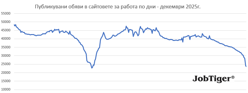 Въпреки че изглежда сериозен, този спад е напълно закономерен за периода. Празничните дни около Коледа и Нова година традиционно забавят или временно спират работните процеси за 10–15 дни, включително и активните кампании по подбор.