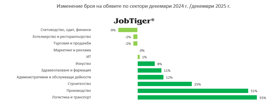 В последния месец на изминалата 2025 г. обявите за работа са намалели с 33% спрямо ноември. Според месечния анализ на HR компанията и кариерен сайт JobTiger спадът възлиза на близо 11 600 предложения по-малко на месечна база, като общият брой на обявите в края на м. декември е около 23 600.