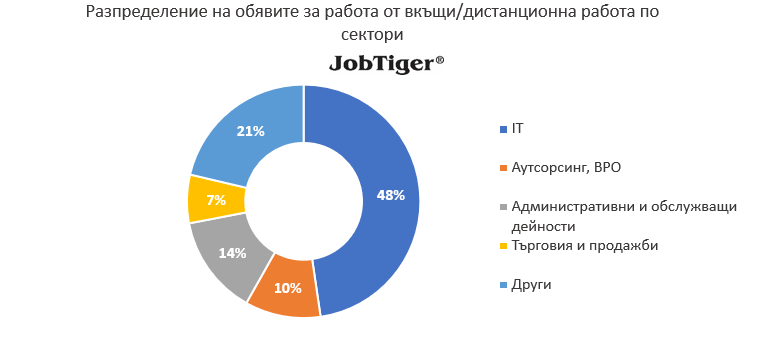 Разпределението на този тип предложения по сектори е, както следва: 48% в сектора „ИТ“, следвани от „Административни и обслужващи дейности“ (14%), секторите на аутсорсинг (BPO) индустрията (10%) и „Търговия и продажби“ (7%).
