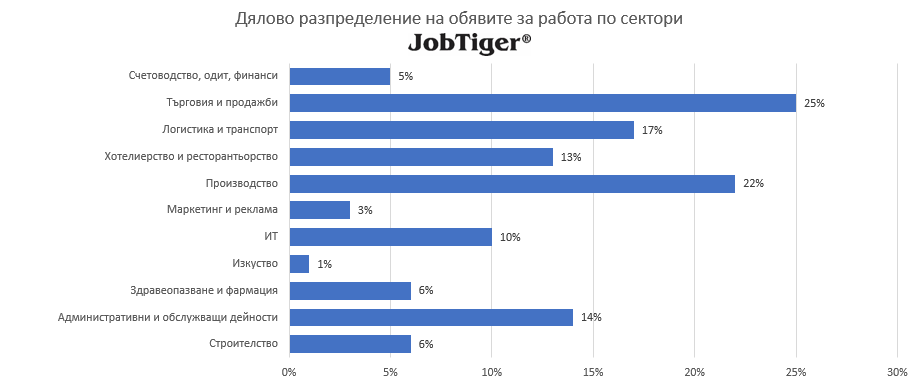 По отношение на дяловото разпределение на обявите по сектори на първо място е секторът „Търговия и продажби“ с 25 %, следван от секторите „Производство“ (22%) и „Логистика и транспорт“ (17%), следвани от секторите „Административни и обслужващи дейности“ (14%), „Хотелиерство и ресторантьорство“ (13%), „ИТ“ (10%), „Строителство“ (6%), „Здравеопазване и фармация“ (6%), „Счетоводство, одит, финанси“ (5%), „Маркетинг и реклама“ (3%) и „Изкуство“ (1%).