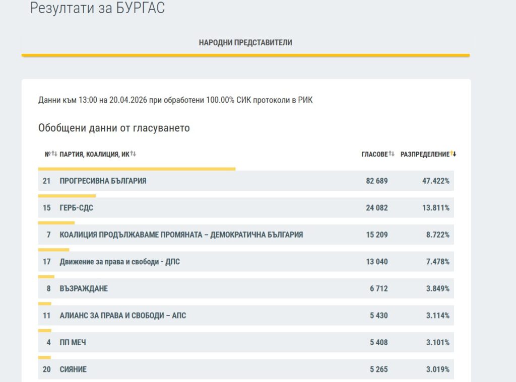 При 100% обработени протоколи на СИК към 13:00 часа на 20 април 2026 г. Прогресивна България печели убедително изборите в област Бургас с 82 689 гласа, което представлява 47.42% от вота.