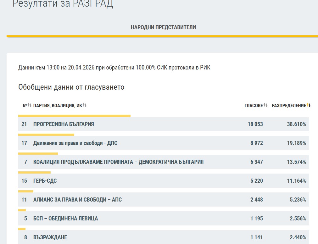 При 100% обработени протоколи на СИК към 13:00 часа на 20 април 2026 г. Прогресивна България печели в област Разград с 18 053 гласа, което представлява 38.61% от вота.