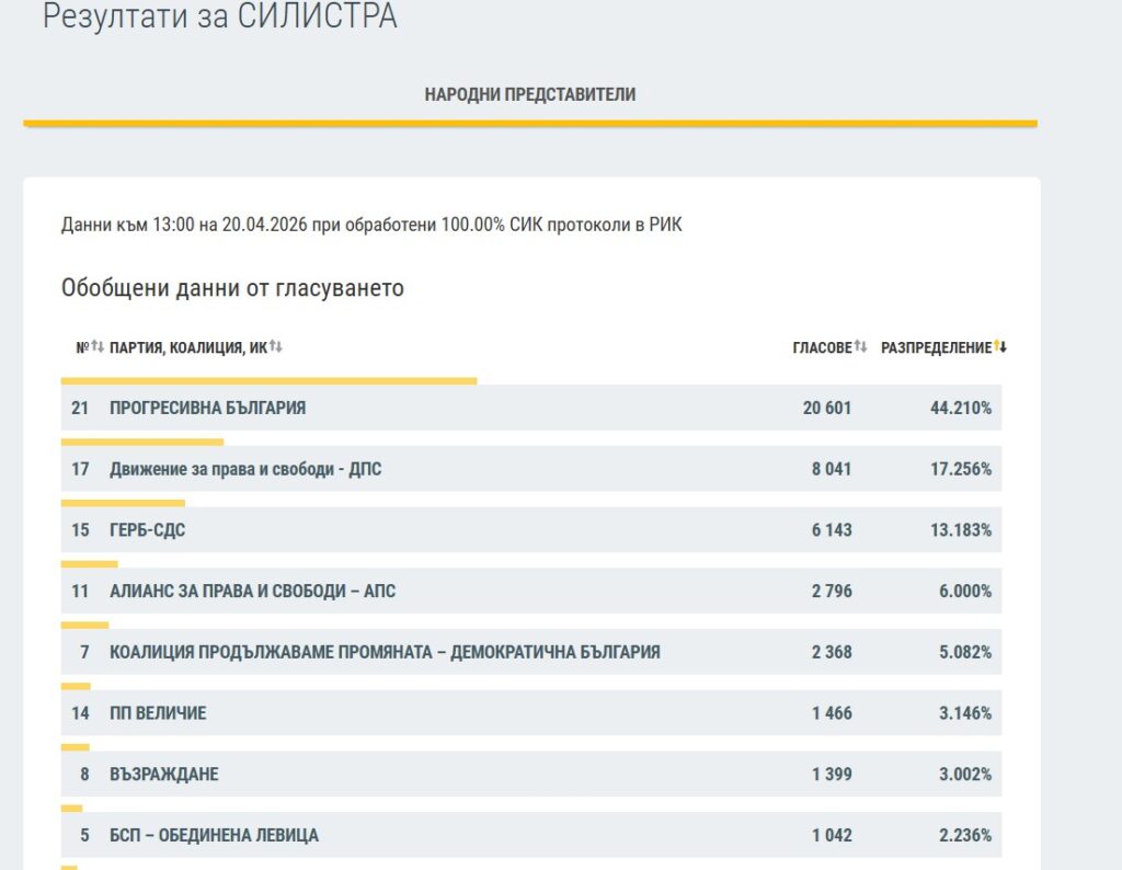 При 100% обработени протоколи на СИК към 13:00 часа на 20 април 2026 г. Прогресивна България е категоричният победител в област Силистра с 20 601 гласа или 44.21% от вота.