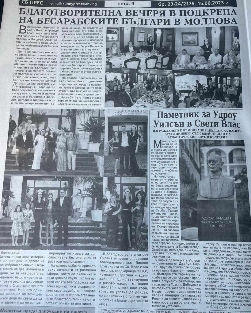 Бесарабските българи в чужбина имат нужда да знаят, че не са изоставени и не са забравени от родината си. Именно затова повече от година и половина участвам и организирам благотворителни събития, чрез които набираме средства за бесарабските българчета зад граница. Това каза за TheSite24 Мисис България Вселена 2022 Оксана Желяпова. Тя посочи, че в рамките на една година са били реализирани две събития, на които са събрани средства за бесарабските българи в Молдова.