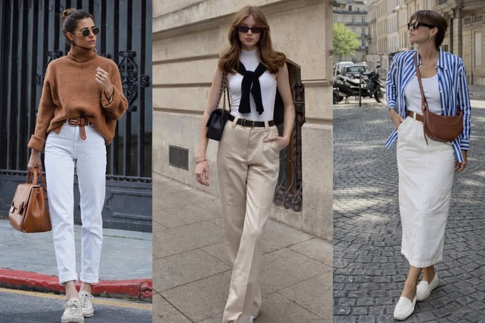 Класически панталони с ръб, бели ризи, прави рокли, тренчкоти и кашмирени палта – дрехи, които не остаряват визуално и могат да се комбинират години наред.