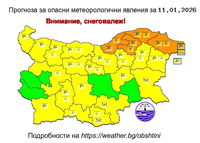 За 11 януари 2026 г. Национален институт по метеорология и хидрология издава предупреждение за опасни метеорологични явления в 23 области на България. Очакват се силен вятър, интензивни снеговалежи, виелици и навявания, като в част от страната обстановката ще бъде сериозно усложнена, съобщават от Националния институт по метеорология и хидрология (НИМХ).