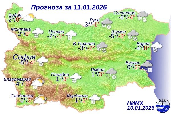 В крайните югоизточни части на страната валежите ще са предимно от дъжд, но застудяването ще обхване и тези райони. Температурите ще останат почти без денонощен ход – минималните ще бъдат между минус 6° и минус 1°, а максималните – между минус 5° и 0°, като по-високи стойности се очакват по Южното Черноморие. В София температурите ще се задържат около минус 4°.