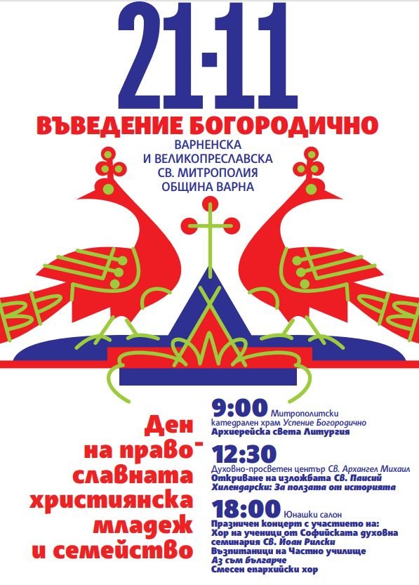 Празничен концерт с участието на Хора на учениците от Софийската духовна семинария „Св. Йоан Рилски“, на възпитаниците на частното училище „Аз съм българче“ и Смесения епархийски хор ще се проведе на 21-ви ноември от 18 ч. в Юнашкия салон. Организатор на събитието е Варненската и Великопреславска митрополия със съдействието на Община Варна. Концертът е част от събитията по повод Въведение Богородично – Ден на православната християнска младеж и семейство.