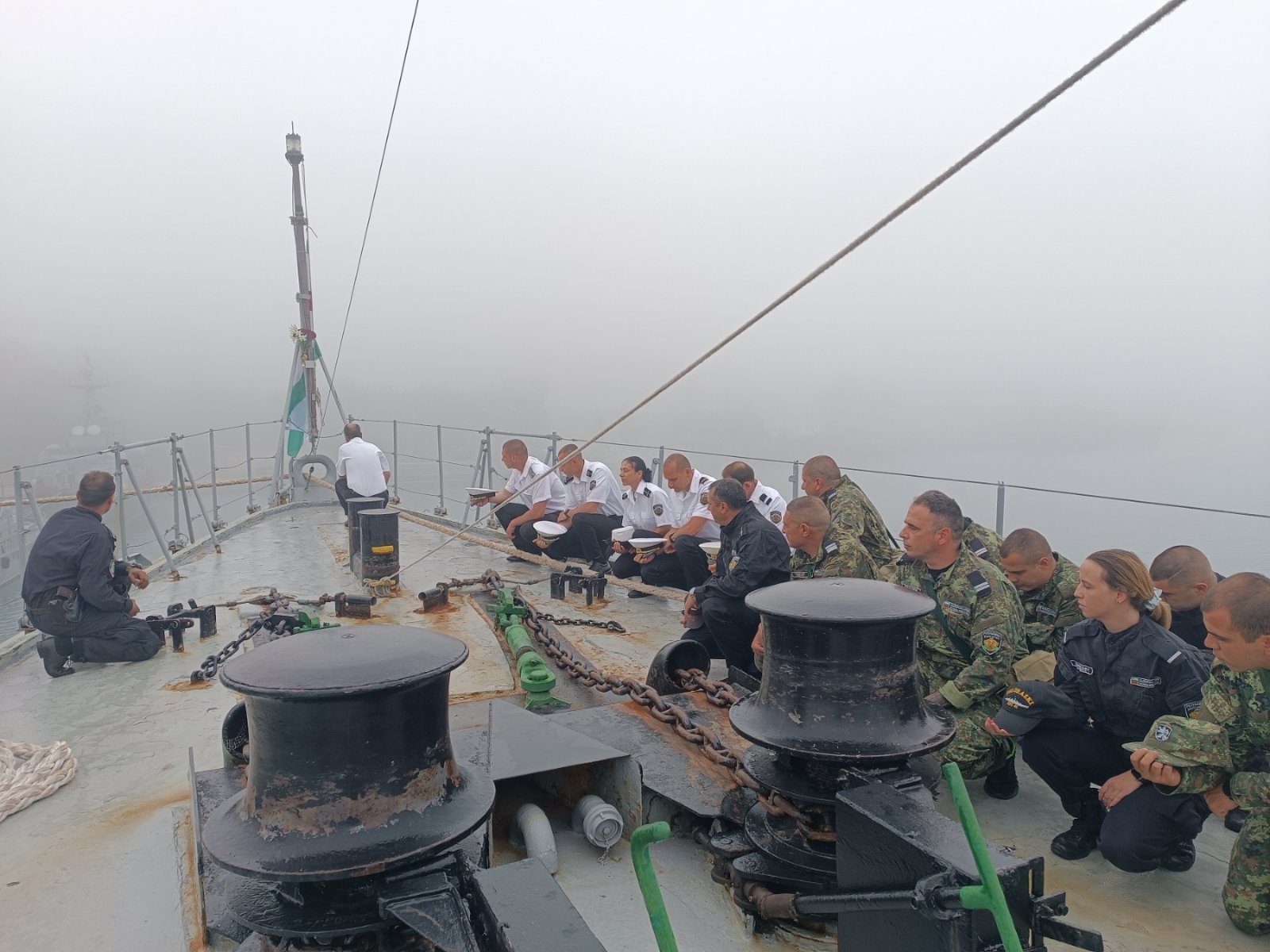 Командването и екипажът на фрегата „Дръзки“ отдадоха почит на загиналия пилот, поднасяйки цветя на паметната плоча на борда на фрегатата.