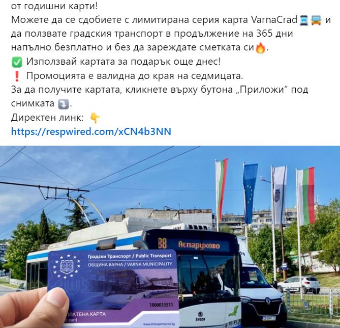 „Градски транспорт Варна“ ЕООД стартира лимитирана серия от годишни карти! Можете да се сдобиете с лимитирана серия карта VarnaCrad и да ползвате градския транспорт в продължение на 365 дни напълно безплатно и без да зареждате сметката си. Използвай картата за подарък още днес! Промоцията е валидна до края на седмицата. За да получите картата, кликнете върху бутона „Приложи“ под снимката”.