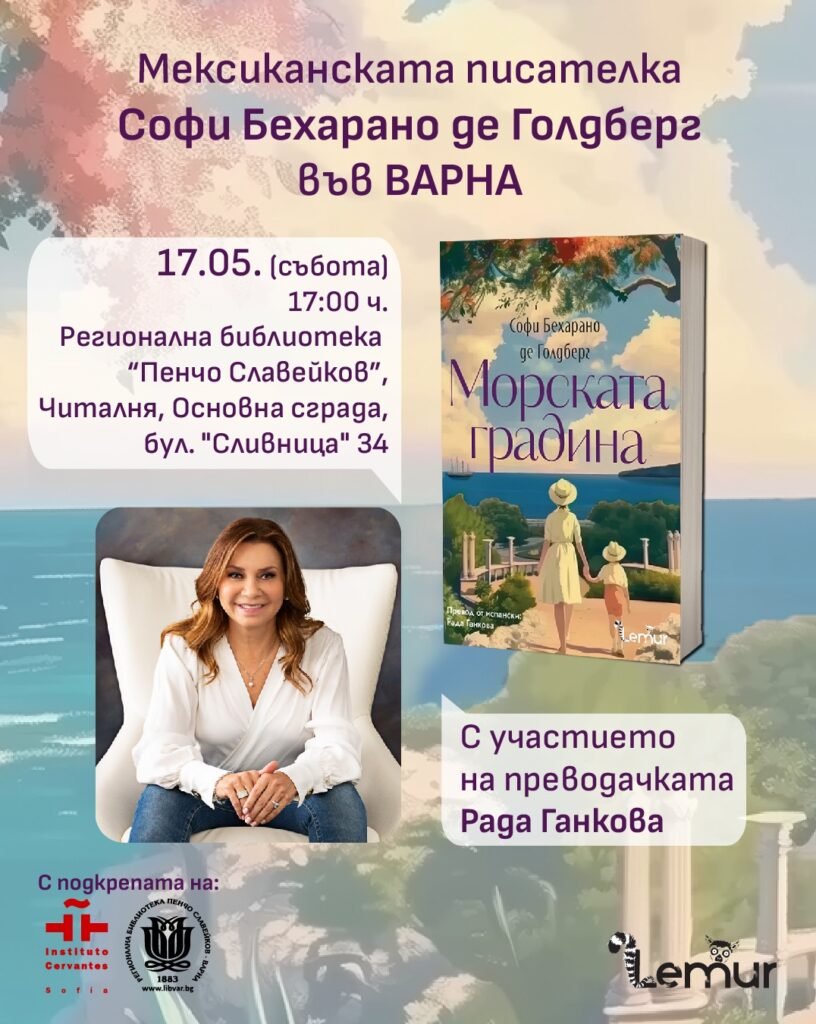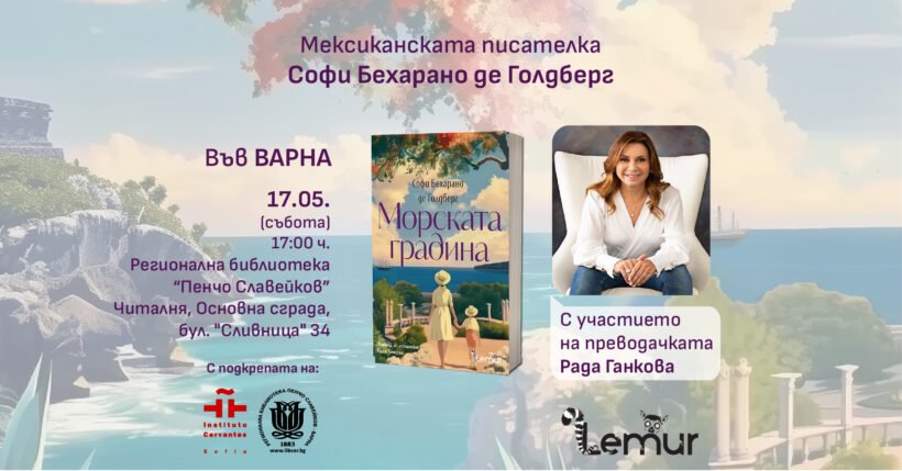 Мексиканската писателка Софи Бехарано де Голдберг ще бъде специален гост във Варна на 17 май, по повод българската премиера на книгата ѝ „Морската градина“. Събитието ще се състои от 17:00 ч. в Читалнята на Регионална библиотека „Пенчо Славейков“ (бул. „Сливница“ 34), с вход свободен.
