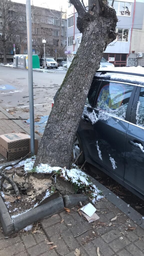При инцидента са нанесени леки материални щети по паркиран под дървото автомобил, както и по тротоарната настилка. Дървесният отпадък се почиства от озеленителната фирма „Бютифул гардън“, която обслужва района.