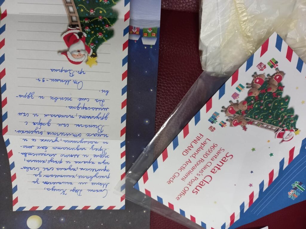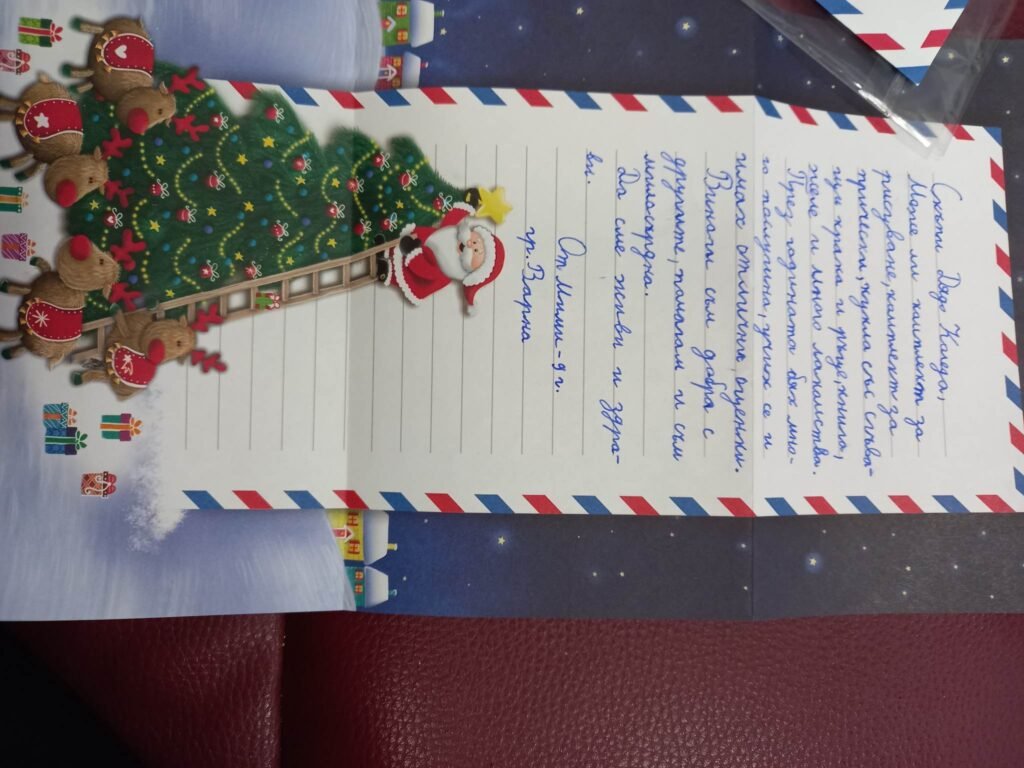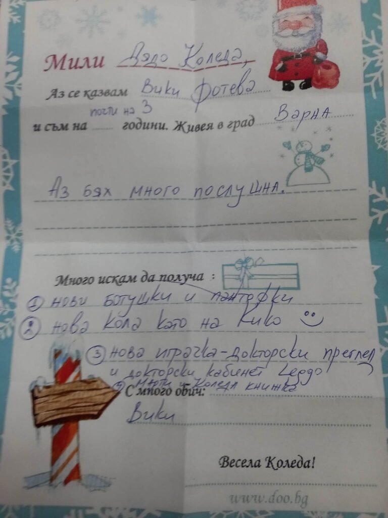 „Скъпи Дядо Коледа, може ли комплект за рисуване, комплект за прически, кукли със сгъващи крака и ръце, книга, желе и много лакомства. През годината бях много послушна, учих се и имах отлични оценки. Винаги съм добра с другите, помагам им и съм милосърдна”. От Мими – 9 г. , Варна