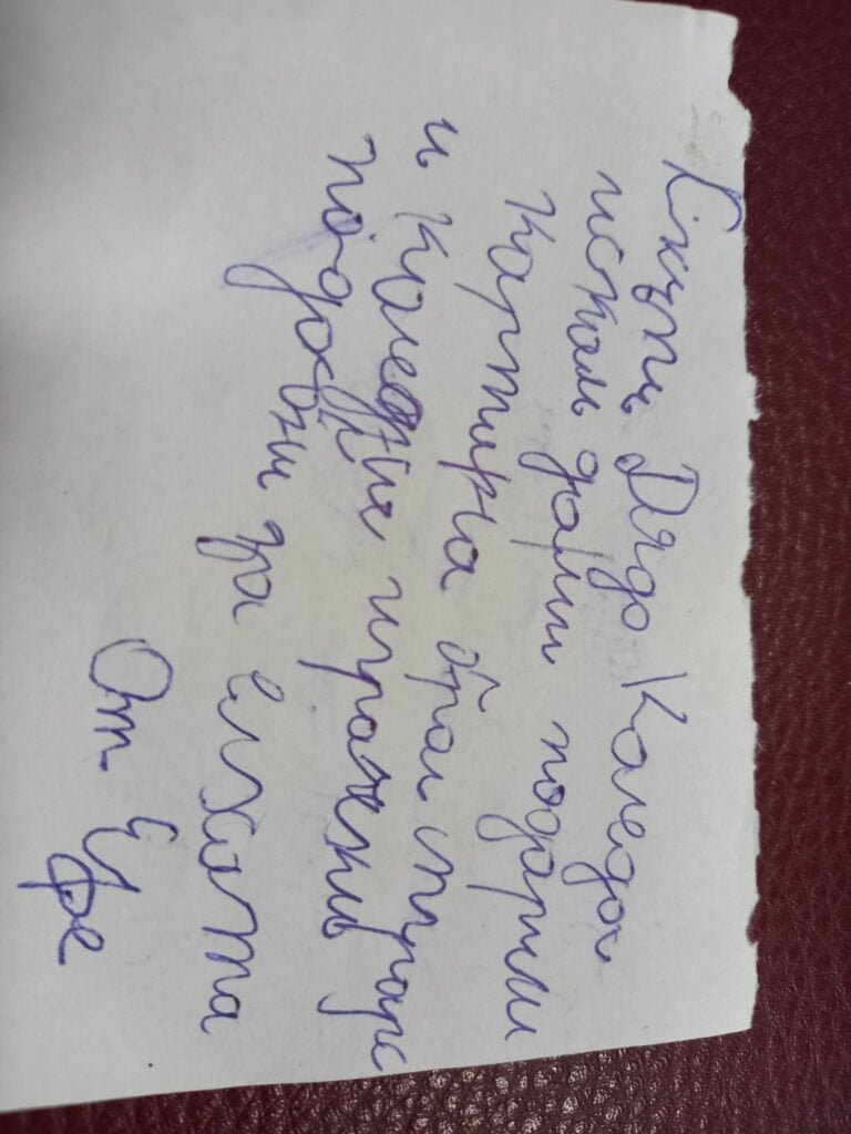 „Мили Дядо Коледа, аз се казвам Магдалена Янева и съм на 3 г. През цялата година бях послушно дете, защото си лягах на време в леглото и си изяждах всичката храна, не правех бели. Слушах много мама и татко. Моля те да ми донесеш за Коледа подарък, опакован в син цвят, а вътре да има изненад” Благодаря много! / подпис/.