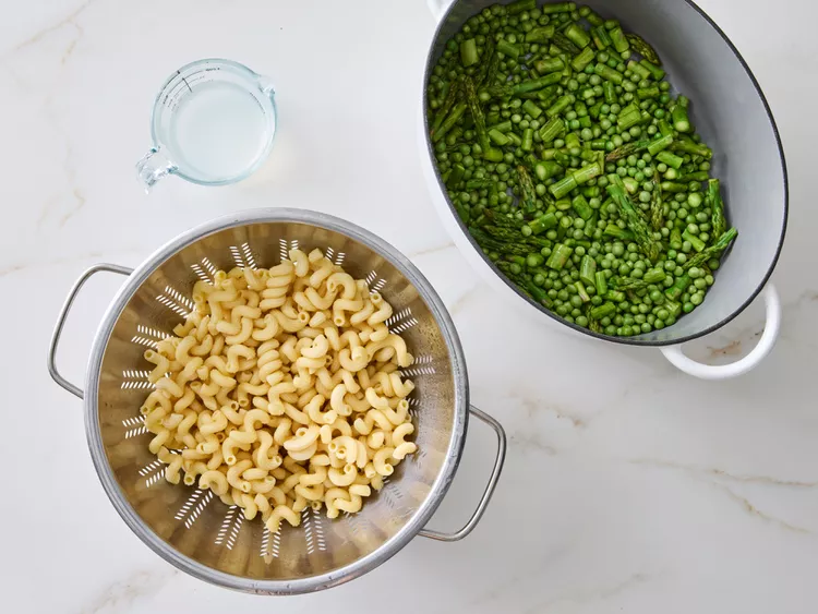 • Сварете пастата в подсолена вода до „ал денте“. Добавете граха и аспержите през последните 3 минути. Отделете ⅔ ч.ч. от водата и отцедете.