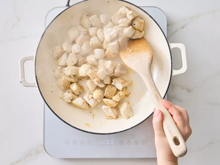 • Запържете пилето в 1 с.л. зехтин, овкусено със сол и пипер, до златисто и напълно сготвено.