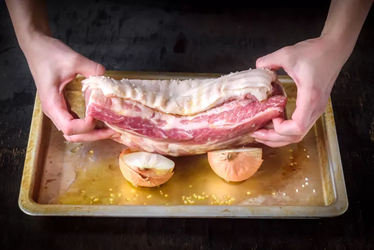 1. Поставете свинското в тава за печене и подпъхнете половинките лук под месото.