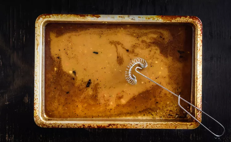 1. Извадете лука от тавата. Сложете тавата на котлона и загрейте на висока температура, докато соковете започнат да бълбукат.