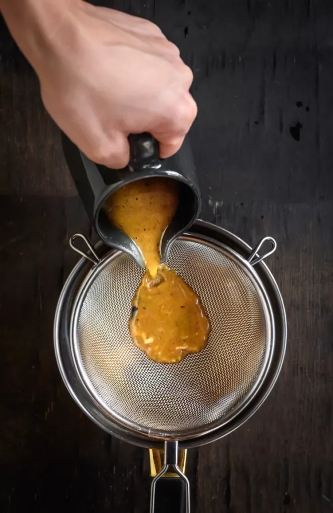 5. Прецедете соса и върнете в касерола. Прибавете студеното масло на малки кубчета и разклатете внимателно, докато се разтопи и сосът стане кадифен.