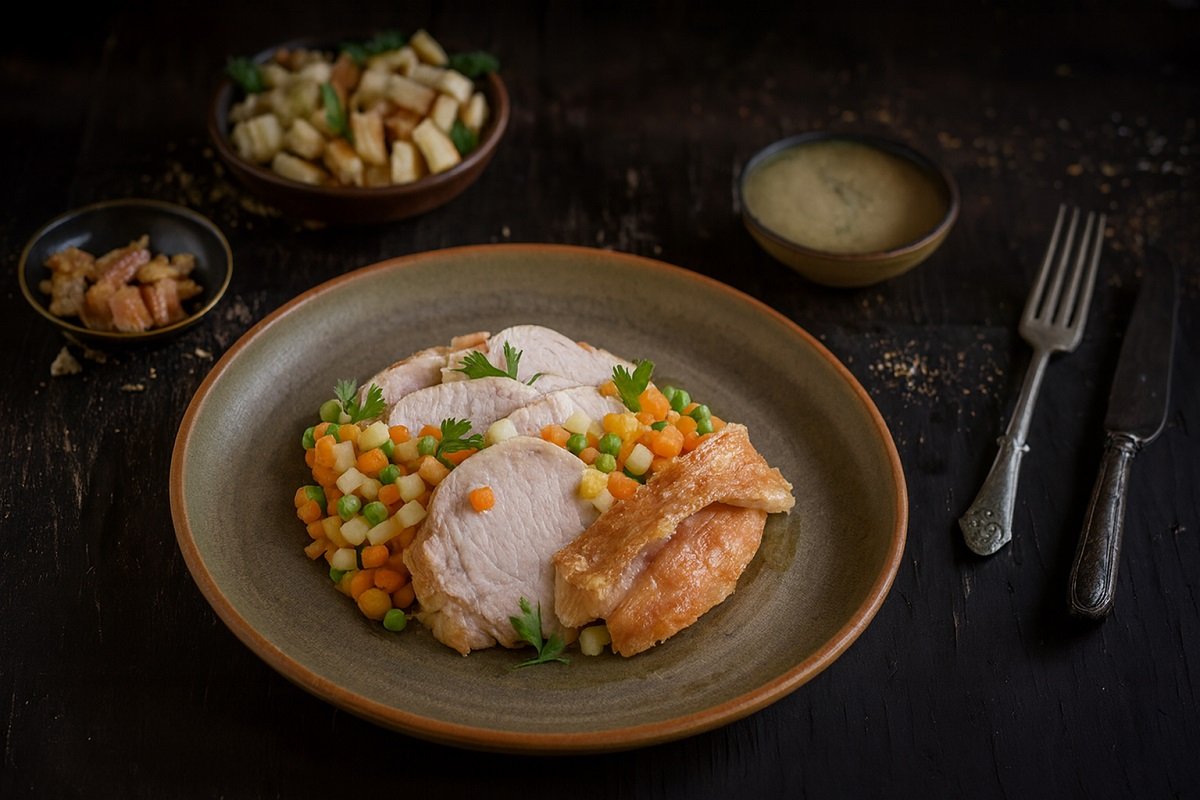 Към това съвършенство прибавяме кадифен сос, който допълва вкуса, а за гарнитура можете да сервирате сезонни зеленчуци, ябълково пюре и ароматен пълнеж със салвия и лук.