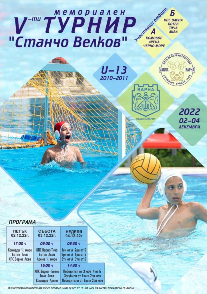 Пети турнир по водна топка „Станчо Велков“ ще се проведе от 2-ри до 4-ти декември на басейн “Д-р Любен Лазаров” в плувен комплекс „Приморски“. Проявата се организира от клуб по плувни спортове „Варна“ със съдействието на дирекция “Спорт” към Община Варна. В състезанието ще вземат участие пет отбора от Варна – “Комодор”, “Аква спорт”, “Черно море”, “Тича” и КПС, както и “Ботев” – Враца и “Арена” – Бургас.