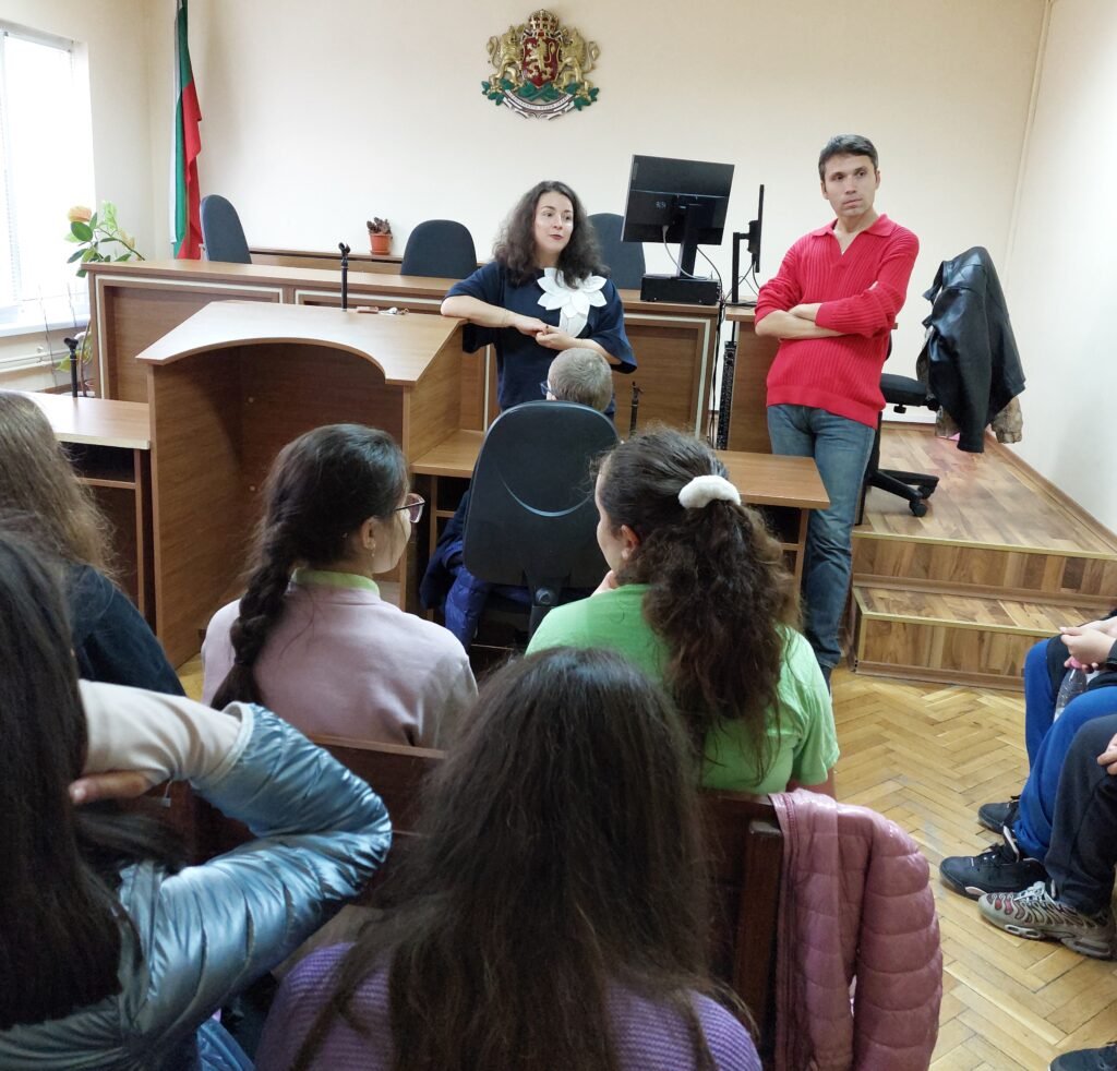 Съдиите Георгиева и Пушевски акцентираха върху важността от спазването на правилата в училище, на улицата и вкъщи, върху проверяването и развиването на критичност към разпространявана в интернет приложения за споделяне и социални мрежи информация и контакти. С 5-класниците бе коментирана чувствителната тема за домашното насилие, провеждането на изслушвания на деца в „Синя стая“, както и органите, които могат да им окажат съдействие и подкрепа при необходимост. Засегната бе още и темата за рисковете от пробването и разпространението на опасната мода на вейповете сред ученици, за безопасното придвижване в градски условия с тротинетки, ховъбордове, колело или скейтборд и за нужното съобразяване с различните участници в движението.