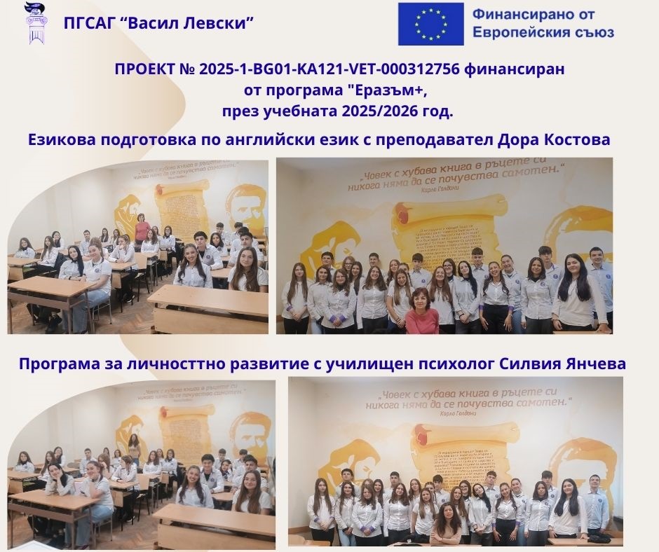 Професионалната гимназия по строителство, архитектура и геодезия „Васил Левски“ – Варна е бенефициент по Проект № 2025-1-BG01-KA121-VET-000312756 по Програма „Еразъм+“ на Европейския съюз, Ключова дейност 1 „Образователна мобилност за граждани“, в сектор „Професионално образование и обучение“.
