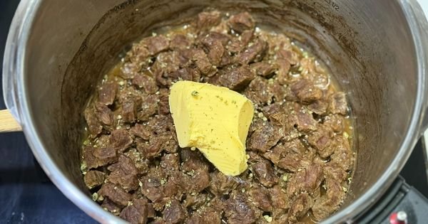 Към свареното месо добавете 1 с.л. масло и го запържете за кратък, ароматен завършек.