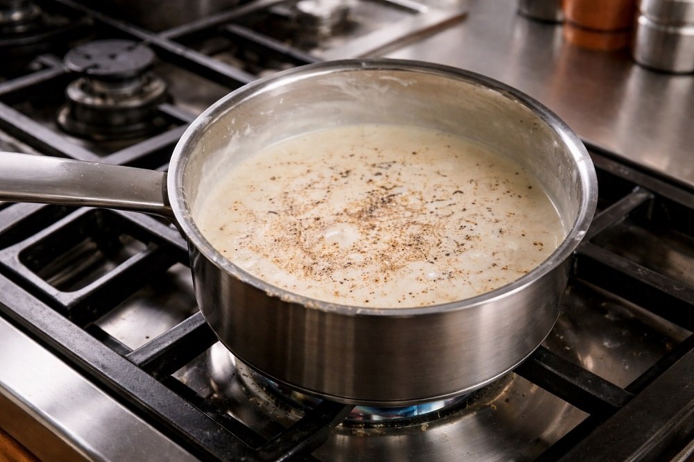 - Налейте студеното мляко на тънка струя, като бъркате непрекъснато, докато сосът се сгъсти.