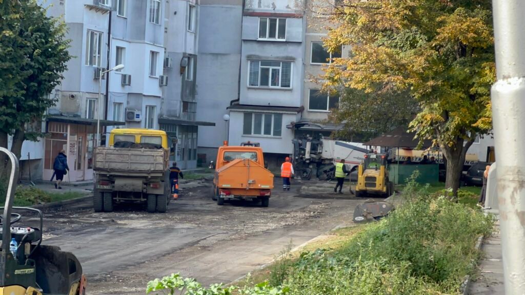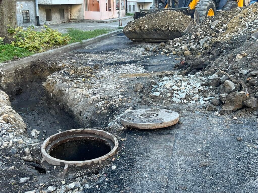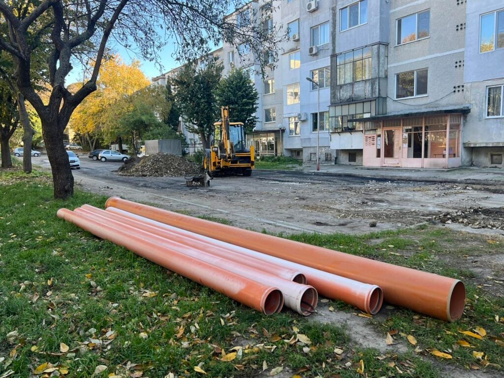 Камиони, багери и други специализирани автомобили работят на терен пред бл. 16, където освен преасфалтиране на паркинга, предстои изграждането на още две отводнителни шахти.