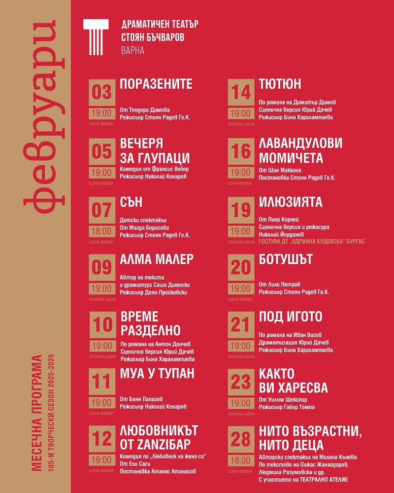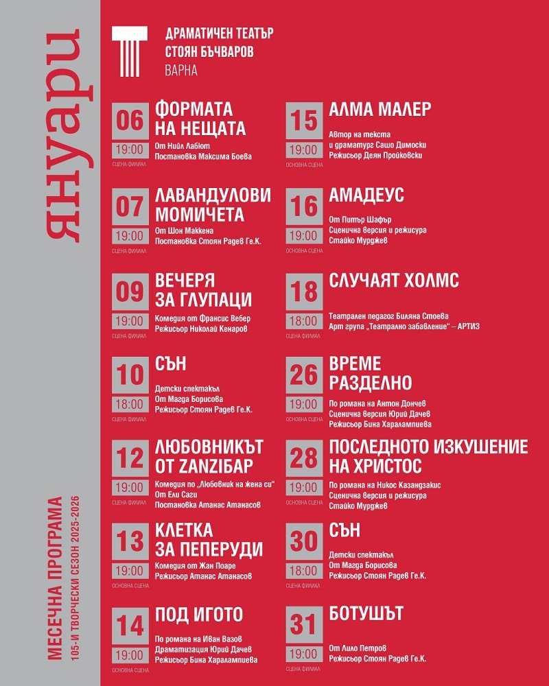 Драматичен театър „Стоян Бъчваров“ – Варна напомня, че остават последни дни от празничната кампания с намалени билети за представленията през януари и февруари 2026 година.
