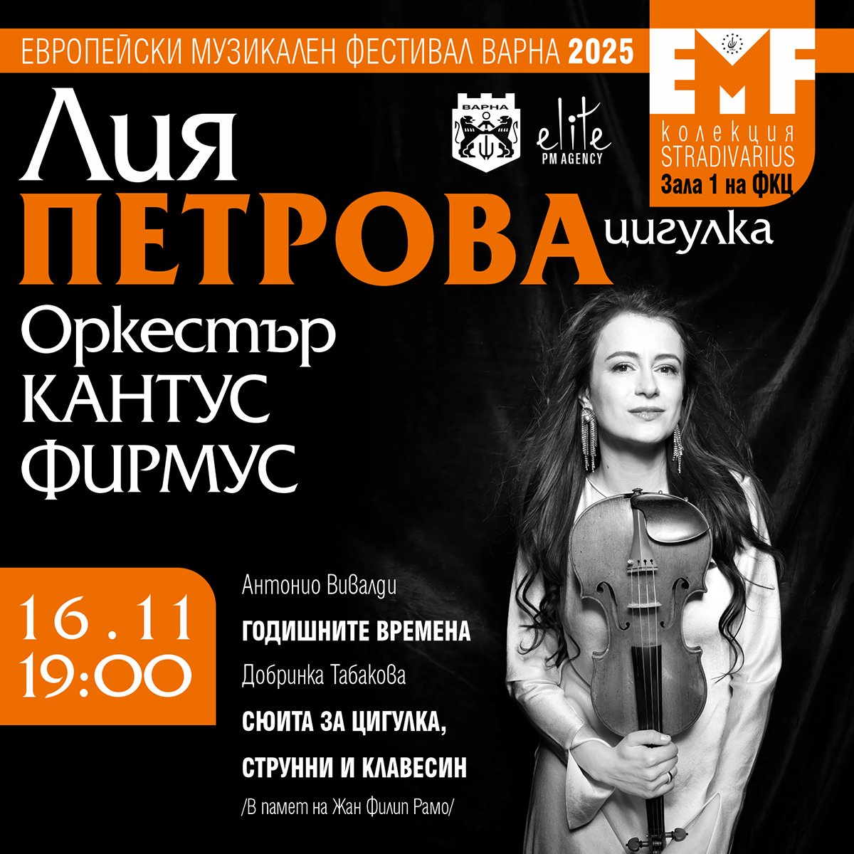 На 16 ноември от 19:00 часа Зала 1 на Фестивалния и конгресен център виртуозната цигуларка Лия Петрова ще бъде солист на концерта в рамките на елитния цикъл „Колекция Страдивариус“. Проектът на “Кантус Фирмус”, реализиран в София и Варна, представя ценни инструменти, шедьоври на великите майстори от Кремона.