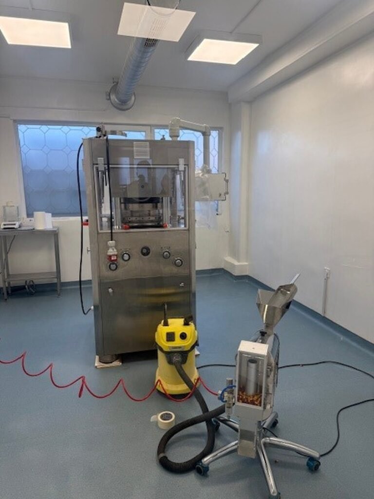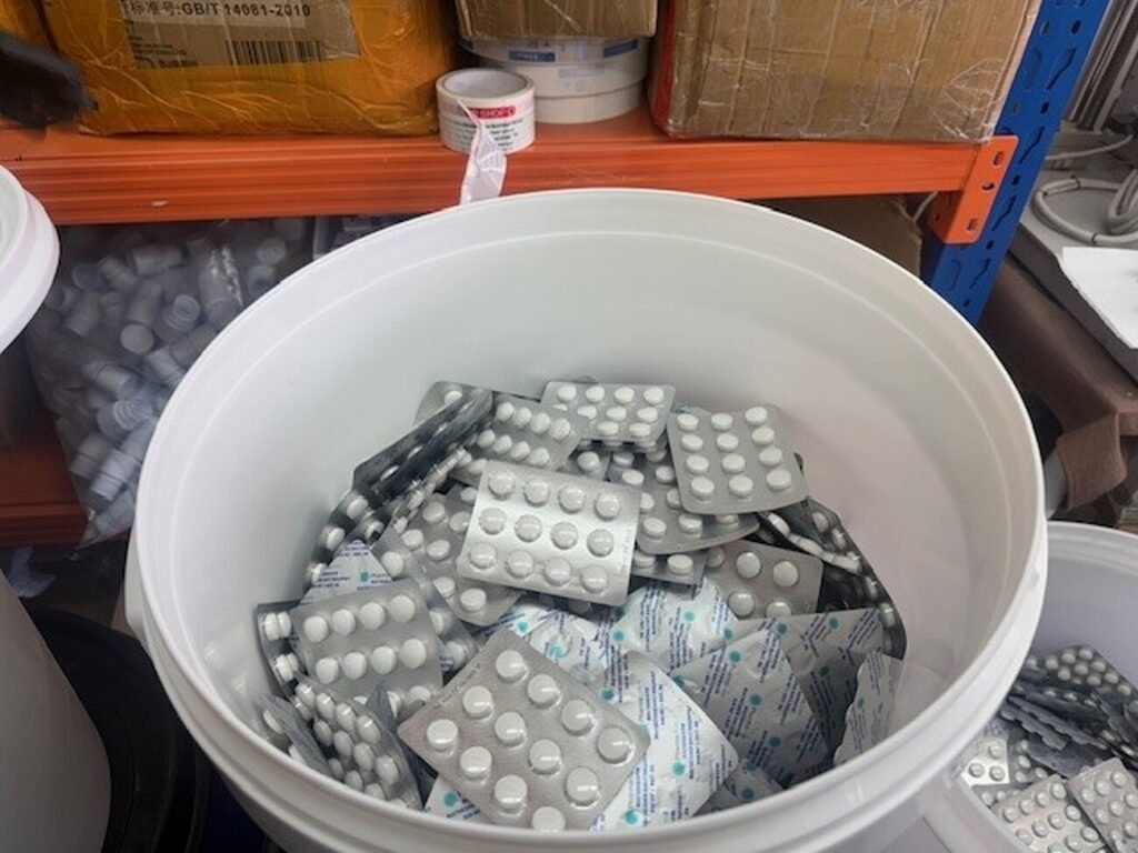 В хода на предприетите действия, започнали по предварително събрана информация, са установени помещенията, които мъж, известен на МВР с полицейска регистрация от 2022 г. за същото престъпление, е ползвал за престъпната си дейност – производство на течни препарати и таблетки и пълненето им в ампули и блистери.