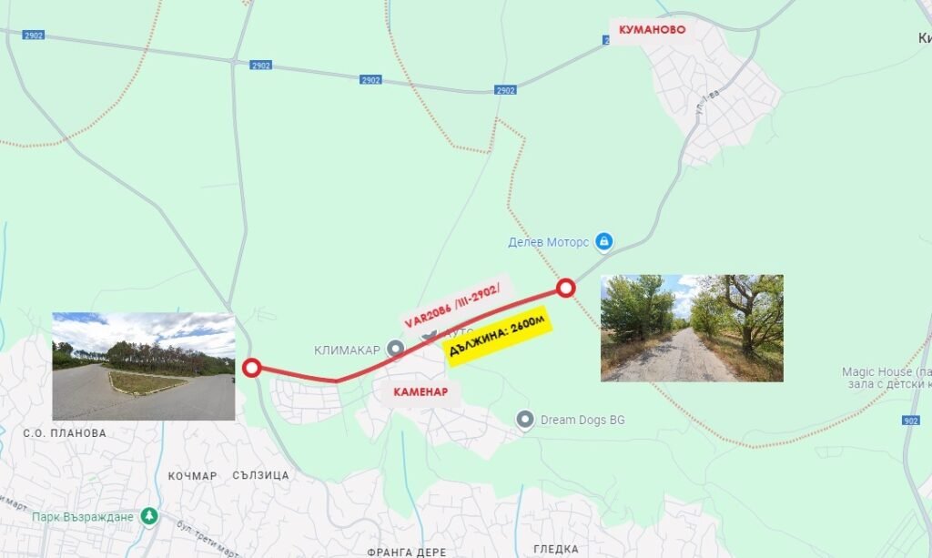 Община Варна завърши обществената поръчка за проектиране на „Основен ремонт на общински път VAR 2086 от с. Куманово до с. Каменар“, за частта, за която отговаря Общината. Проектът е готов и е представен за следващ етап – избор на изпълнител за основния ремонт на пътя между двете села. Прогнозната стойност на строително-монтажните работи е около 3,5 млн. лв. Ремонтът трябва да се реализира през 2025 г.
