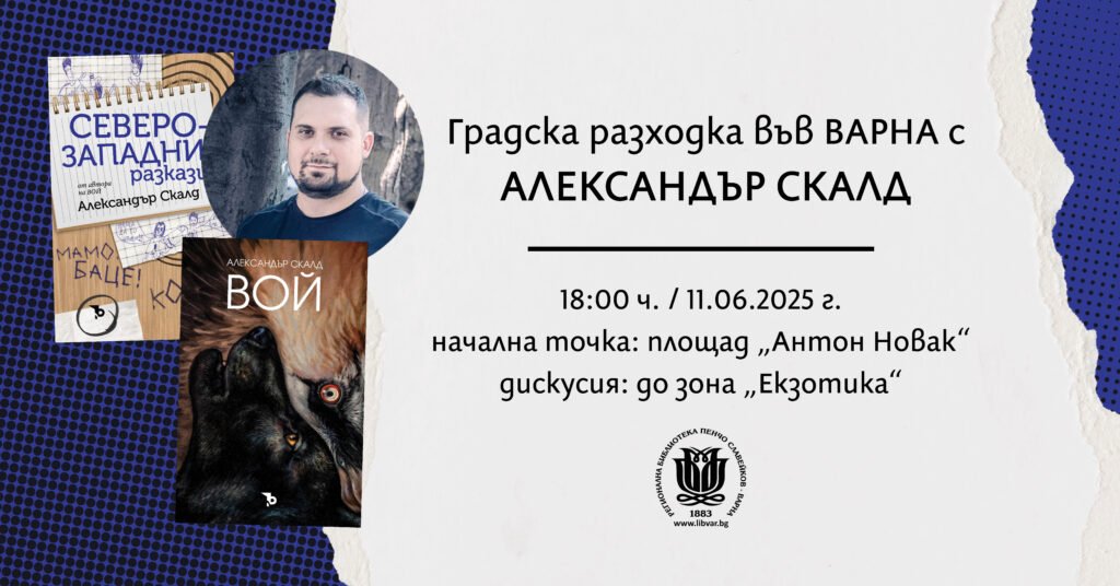 Регионалната библиотека във Варна слага начало на лятната си културна програма с градска разходка и литературна дискусия с Александър Скалд, еколог и писател, автор на фентъзи романа „Вой” и на сборника с кратка проза „Северозападни разкази”. На 11 юни от 18:00 ч. ще тръгнем заедно от площад „Антон Новак“ (входа на Морската градина) и ще разговаряме за природата и нейното място в работата и творчеството на Скалд. Ще завършим разходката до зона „Екзотика“ в Морската градина, където младият писател ще представи книгите си в детайли и ще отговори на въпросите на публиката.