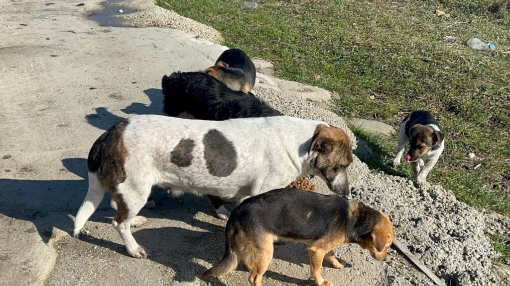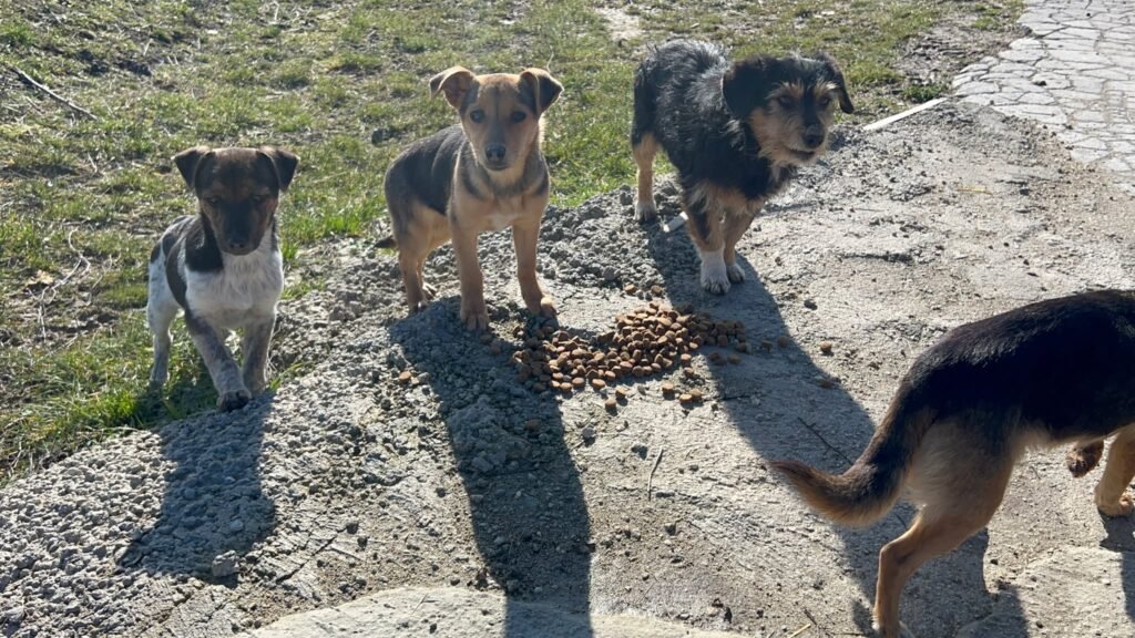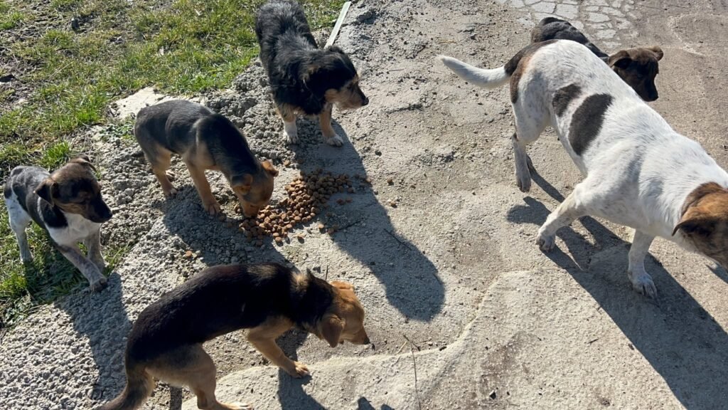 Посреща ни необичайна делегация – майка с четири бебета кученца и едно опашато приятелче с тях, които не само тичат дръзко по пътя, но и смело се молят за храна, каквато очевидно рядко виждат в тая пустош. Буди леко недоумение как на метри от приюта некастрирани кучета бродят с паленцата си немили – недраги. Отваряме пакета с гранули, подготвен за гостуването ни в любовния ден и ръсим с пълни шепи щастие за малките гладници.
