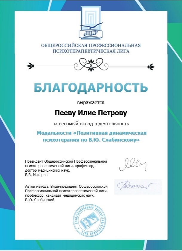 Общоруската Професионална психотерапевтическа лига (ОППЛ) изразява благодарност на Илия Петров Пеев за забележителен принос в дейността на Модалност „Позитивна динамическа психотерапия” по В.Ю. Слабински.