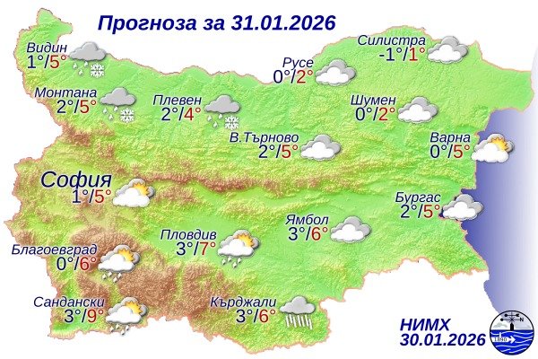 Днес времето ще бъде предимно облачно, като валежите временно ще спрат. Ще духа слаб до умерен вятър от север-североизток. Студен въздух ще продължи да прониква над страната и дневните температури ще останат близки до сутрешните – максималните ще са между 1° и 6°, за Варна около 4°.