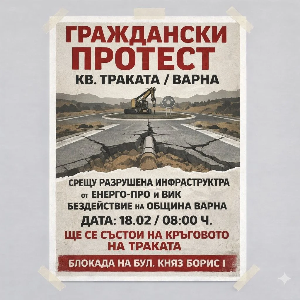 Жители на варненския квартал „Траката“ организират граждански протест заради състоянието на пътната и подземната инфраструктура в района. Акцията ще се проведе на 18 февруари от 08:00 часа на кръговото кръстовище в квартала и ще бъде съпътствана от временна блокада на бул. „Княз Борис I“ между 8:00 и 8:30 часа.
