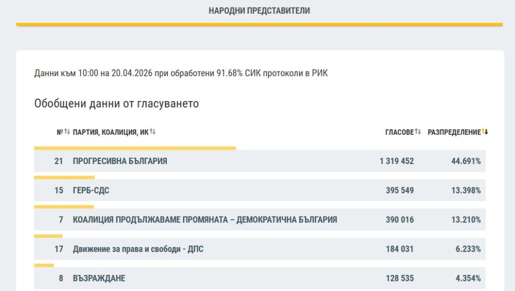 При обработени 91.68% от протоколите на СИК към 10:00 часа на 20 април 2026 г. се очертава ясна преднина за Прогресивна България, която събира 1 319 452 гласа или 44.69% от вота.