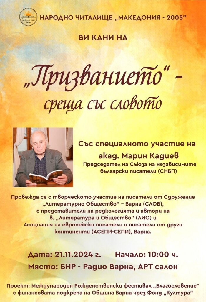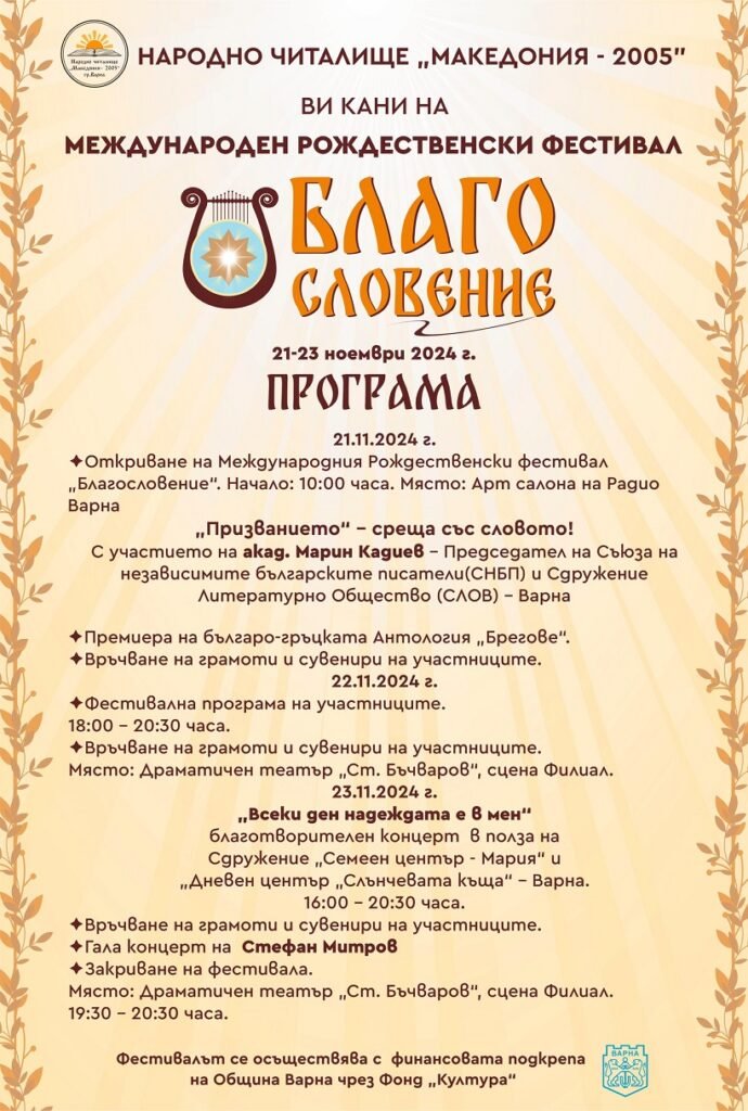 От 21 до 23 ноември Варна е домакин на Рождественския фестивал „Благословение“, организиран от Народно читалище „Македония – 2005“. Фестивалът обхваща всички музикални жанрове и изпълнителски формати, а участниците в него са преди всичко млади дарования от Варна. Фестивалът е с благотворителна кауза в подкрепа на потребителите на услуги към Сдружение „Семеен център – Мария“ и Комплекс за социални услуги „Слънчевата къща“ във Варна.