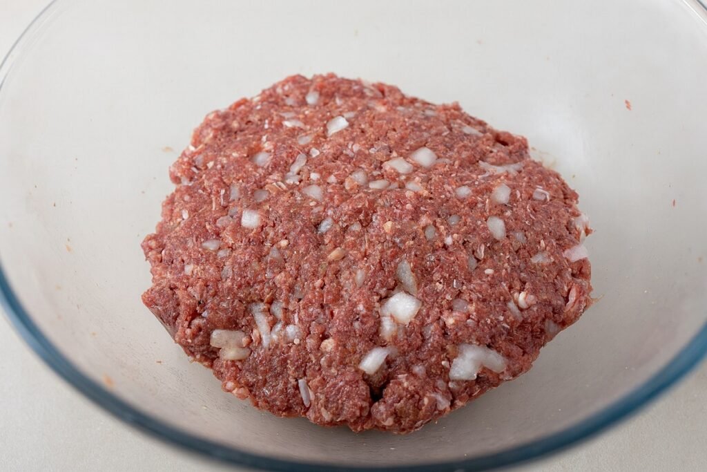 - В купа смесете каймата, лука, двата вида чушки, чесъна, галетата, водата, олиото, солта, черния пипер и магданоза.